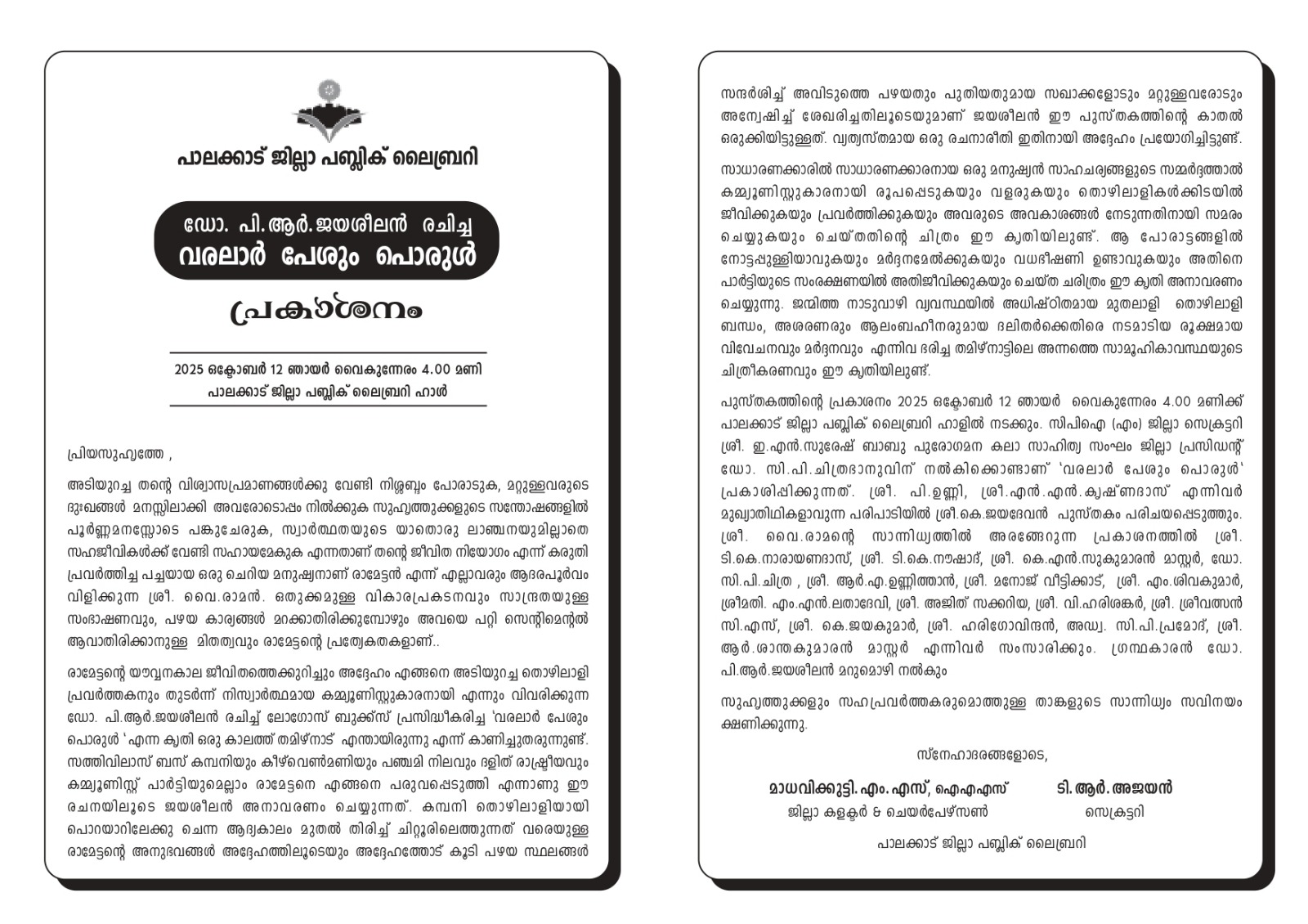 The Library was inaugurated on 29th of June, 2013 with a full day function attended by Mr.M.B.Rajesh.M.P, Mr.M.Chandran.M.L.A, Mr.M.Hamza.M.L.A, Mr.K.Achuthan.M.L.A, Mr.K.V.Vijayadas.M.L.A, Mr.N.Shamsuddeen.M.L.A, Mr. O.Rajagopal, Justice Chettur Sankaran Nair, Mr.C.K.Rajendran, Mr.T.N.Kandamuthan, Mr. P.M. Ali Asgar Pasha.I.A.S, Mr.N.N.Krishnadas.Ex.M.P, Mr.Vaisakhan, Mr.V.K.Sreeraman, Mr.K.E.N.Kunhahammed, ProF.V.N.Murali, Mr.P.A.Vasudevan, Mr. Mundur Sethumadhavan, Mr.Kureeppuzha Sreekumar, Mr.Murukan Kattakkata, Mr.Ravunny, Ms. O.V.Usha, Mr.T.K.Sankaranarayanan, Mr. Sreekrishnapuram Krishnankutty, Mrs. Sreedevi Olappamanna, Dr. K.N. Jayam,Mr.T.K.Narayanadas, Mr.T.N.Niranjan, Mr.E.Jayachandran, Mrs. Jyothibai Pariyadath, Mrs.Subhadra Satheesan, Mr.Jayakrisnan Vallappuzha, Mrs. O.A. Philomina, Mr.V.R.Sivadas, Mr.A.V.V.Potty, Mr.Hari Kodumtharappully etc.