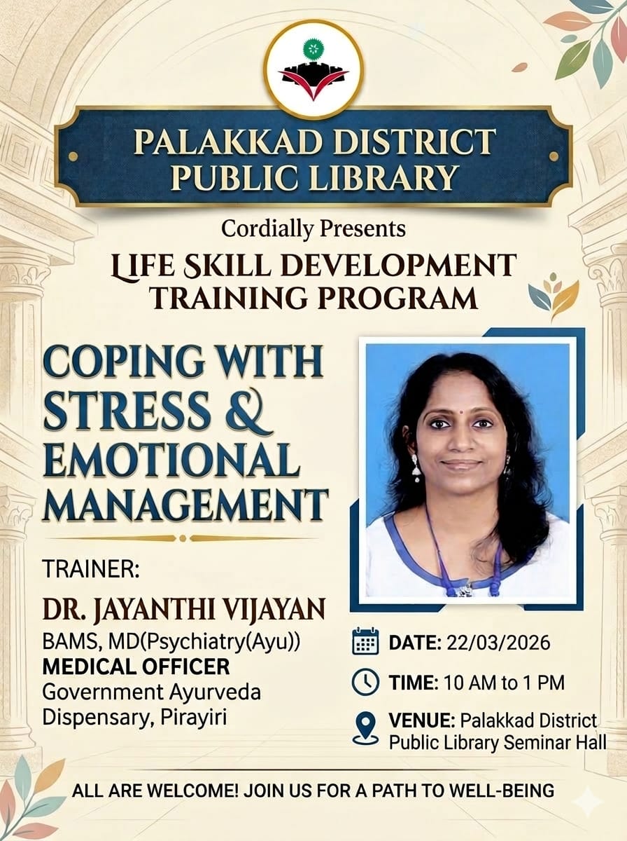 Dear members, patrons and well-wishers, Welcome to the website of the Palakkad District Public Library. We enter our thirteenth year of service with renewed energy and success. Even though we have faced unprecedented challenges in yester years, we have overcome all such hurdles and Palakkad District Public Library is considered as one of the most active libraries of Kerala. This has happened only because of the support we received from all sections of people from every nook and corner of Palakkad District. Palakkad District Public Library is having a membership base of more than 13000 readers. Our collection of books and DVDs has grown to more than 125000. The Palakkad District Public Library is one of a kind in Kerala, and the size and range of its books are unmatched even in many metros throughout India. We offer a wide variety of books and DVDs for study and pleasure. A number of special sections or “Corners” feature favourite and eminent authors and philosophers—Gandhi, Vivekananda, EMS Namboodiripad, O.V. Vijayan and many more. We also have special sections on management, anthropology, Buddhist philosophy, Islamic studies and other fields in our extensive Reference section, many of them sponsored and supported by educational and private institutions. Our Children’s Corner is a bright and cheerful space with over 8000 books in Malayalam and English. The books in the Children’s Corner as well as in the main library boast a diversity that is rarely found in Indian libraries and book shops The library has been the scene of a rich variety of events and programs in literature, art, music, film, heritage and science. Palakkad District Public Library is conducting the following programmes regularly 1. Film Shows on all Sundays 2. Vayana , a discussion on Books monthly 3. Meet the Author programme monthly 4. Sarga Rashmi, a theme based Programme for Children to present their artistic and cultural talents 5. A Lecture on Current Topic by A Speaker of Repute every Month 6. A Lecture on Science & Technology in association with Indian Institute of Technology ,Every Month. 7. UnnikaleOruKadhaParayam, Story Telling to Children twice a month 8. Prathyasha, a Lecture programme to Senior Citizens every month 9. Counselling for Ladies every month 10. VayanaVedi, a Bulletin published Monthly to interact with members. Palakkad District Public Library is on the anvil of new programmes for youth For the comprehensive growth of the youth in the official, cultural and social fields, the following programes are chartered. 1. Life Skill Training Classes led by K. Anil Kumar, 2. Delectivity (Deleting the Negative Attitude Creatively) lecture series for the youth led by Sudeep T. George,. 3. Career guidance classes 4. Lecture series for children participating in competitive exams 5. Table & Stool program, 6. A Film production workshop in collaboration with the Chalachitra Academy 7. Disa Programme for Children in association with Kerala Lalitha Kalaa Akkadami 8. Various Lecture Classes for Elderly People State government and RRLF grants and the generosity of donors have made it possible for us to keep renewing and expanding our collection. Countless members, officials and friends have supported the Palakkad District Public Library with their patronage and hard work. Words cannot express our gratitude for your generous contributions. We look forward for increasing our membership, enlarging the spaces available for our members, and upgrading the library’s facilities and infrastructure. We hope for your continued support in all these endeavours to transform the Palakkad District Public Library into a true Cultural Centre of Kerala. Warm regards to all T.R. Ajayan Secretary, Palakkad District Public Library